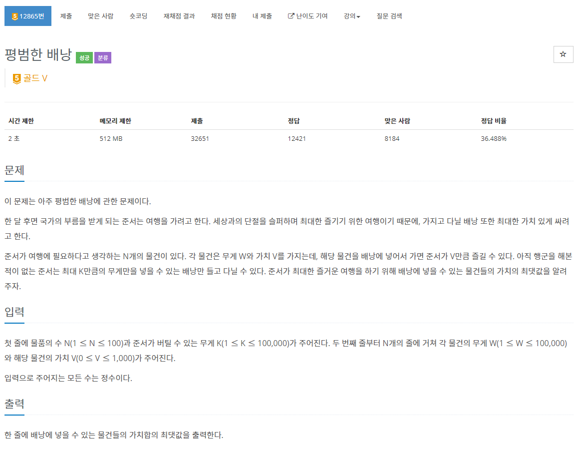 12865번: 평범한 배낭