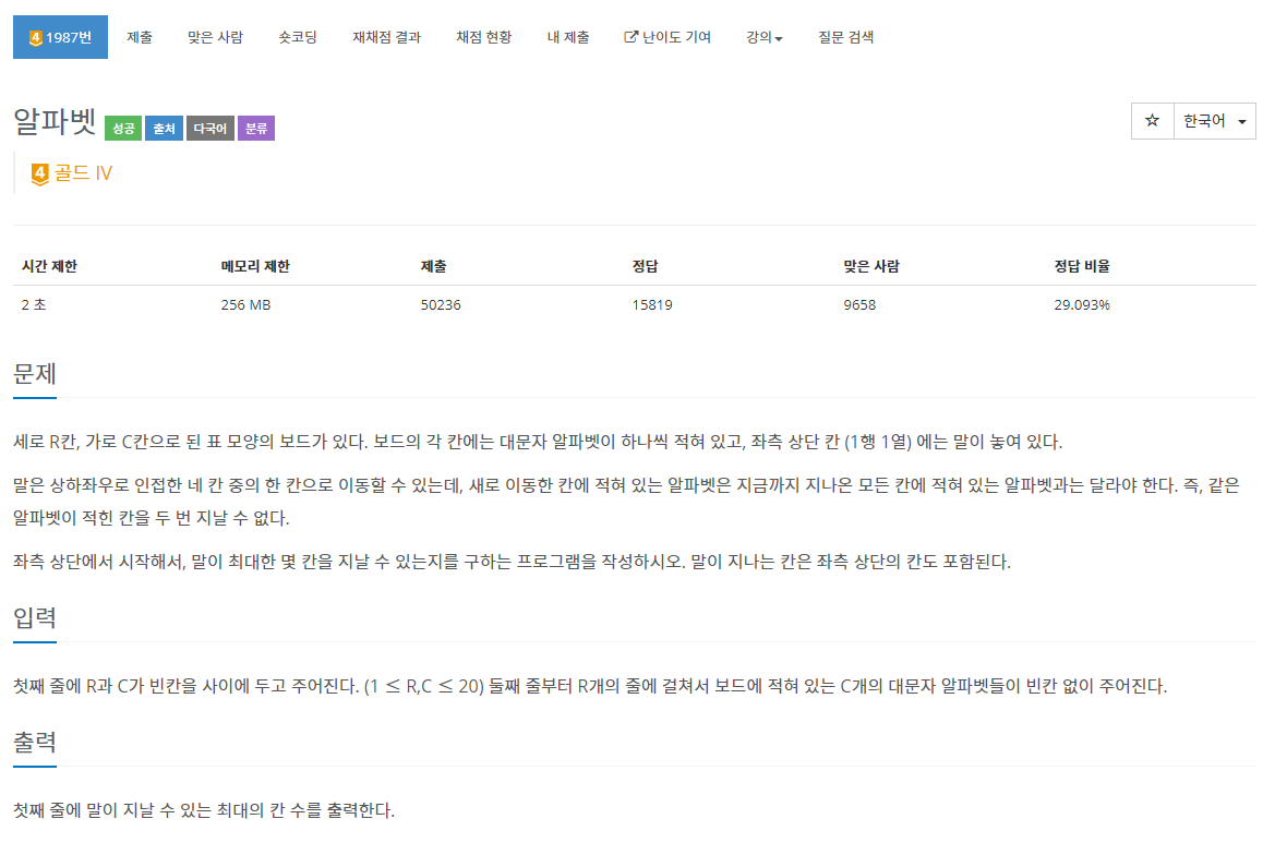 세로 R칸, 가로 C칸으로 된 표 모양의 보드가 있다. 보드의 각 칸에는 대문자 알파벳이 하나씩 적혀 있고, 좌측 상단 칸 (1행 1열) 에는 말이 놓여 있다. 말은 상하좌우로 인접한 네 칸 중의 한 칸으