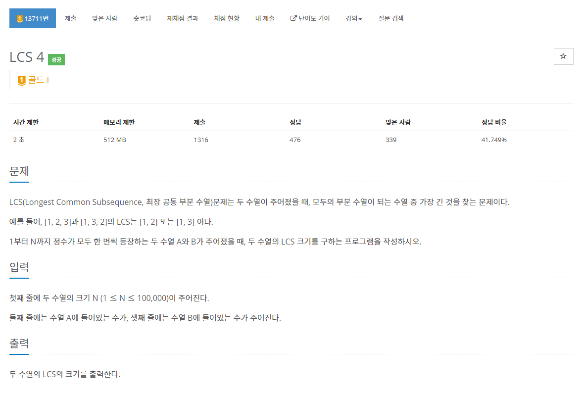 LCS(Longest Common Subsequence, 최장 공통 부분 수열)문제는 두 수열이 주어졌을 때, 모두의 부분 수열이 되는 수열 중 가장 긴 것을 찾는 문제이다. 예를 들어, [1, 2, 3]과 [1, 3, 2]의 LCS는 [1, 2] 또는 [1, 3]