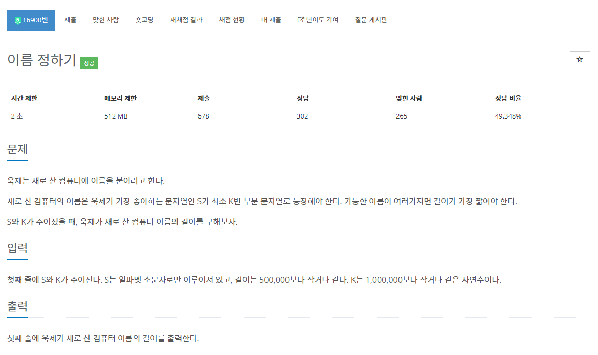 첫째 줄에 S와 K가 주어진다. S는 알파벳 소문자로만 이루어져 있고, 길이는 500,000보다 작거나 같다. K는 1,000,000보다 작거나 같은 자연수이다.