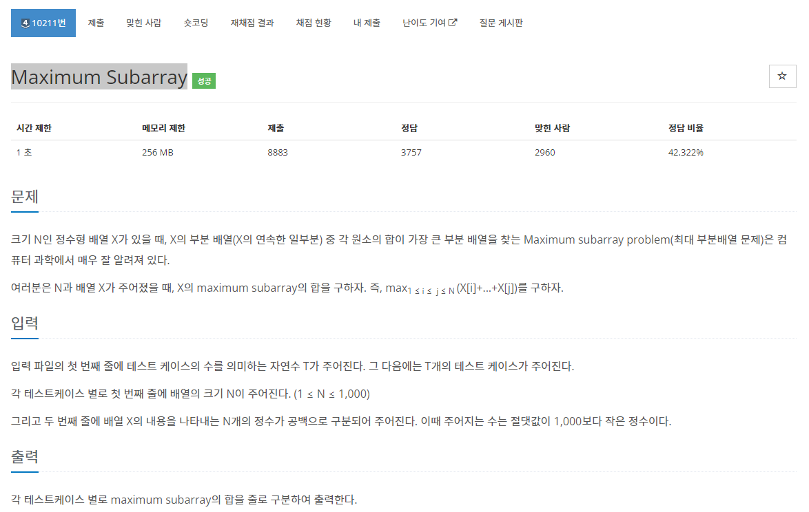 크기 N인 정수형 배열 X가 있을 때, X의 부분 배열(X의 연속한 일부분) 중 각 원소의 합이 가장 큰 부분 배열을 찾는 Maximum subarray problem(최대 부분배열 문제)은 컴퓨터 과학에서 매우 잘 알려져 있