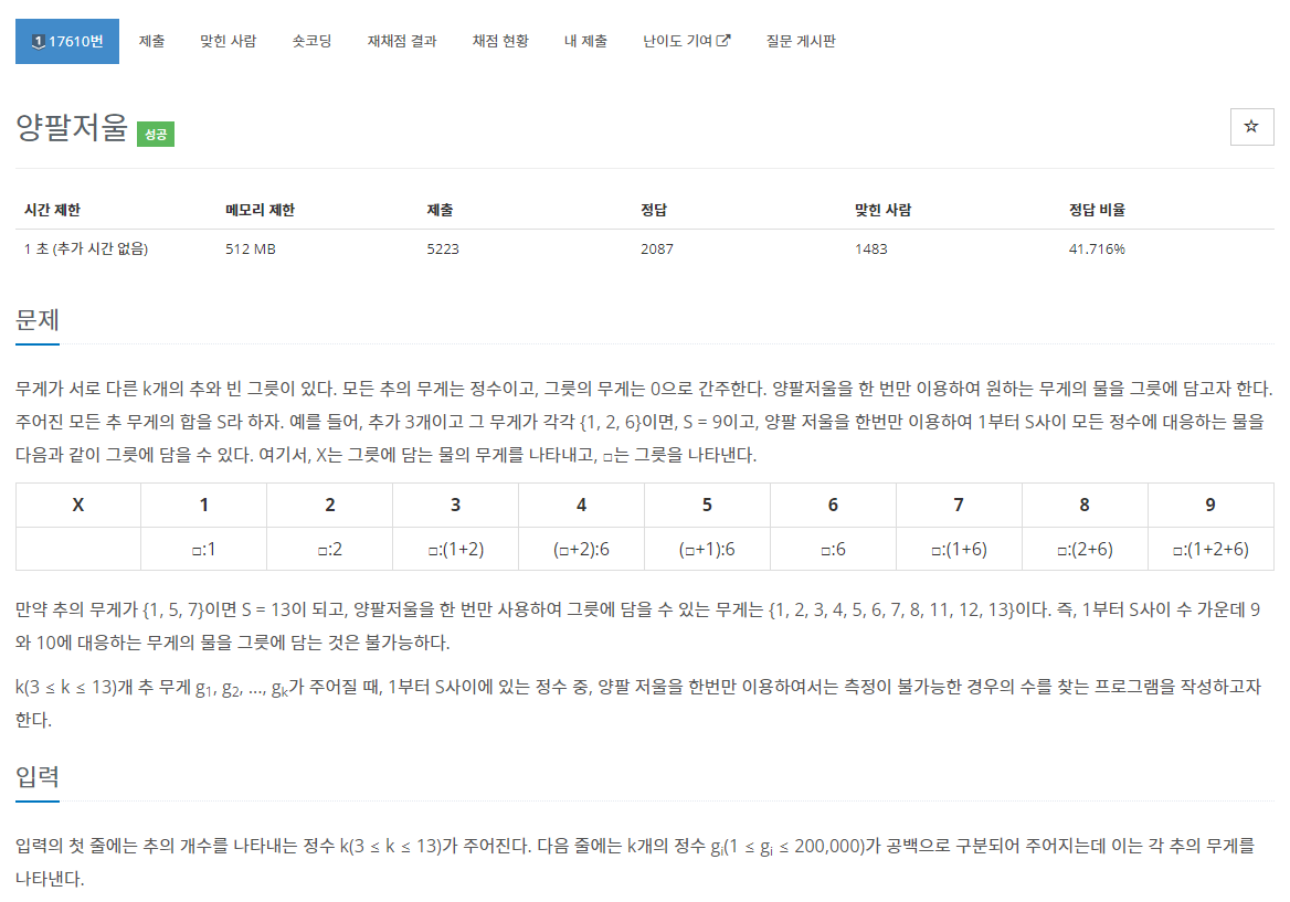 무게가 서로 다른 k개의 추와 빈 그릇이 있다. 모든 추의 무게는 정수이고, 그릇의 무게는 0으로 간주한다. 양팔저울을 한 번만 이용하여 원하는 무게의 물을 그릇에 담고자 한다. 주어진 모든 추