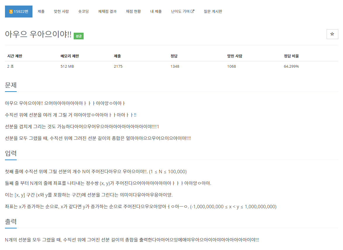N개의 선분을 모두 그렸을 때, 수직선 위에 그어진 선분 길이의 총합을 출력한다아아어으잉에애야우아으아이아야아아아아아아이야!!!