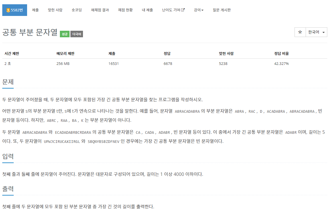 두 문자열이 주어졌을 때, 두 문자열에 모두 포함된 가장 긴 공통 부분 문자열을 찾는 프로그램을 작성하시오. 어떤 문자열 s의 부분 문자열 t란, s에 t가 연속으로 나타나는 것을 말한다. 예를 들