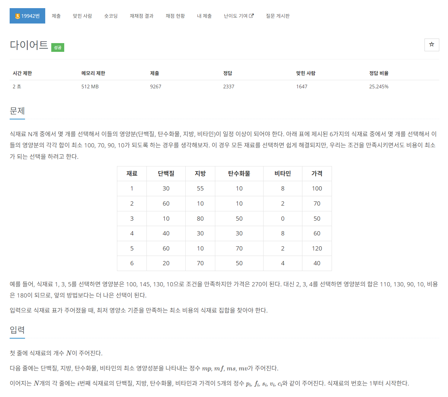 식재료 N개 중에서 몇 개를 선택해서 이들의 영양분(단백질, 탄수화물, 지방, 비타민)이 일정 이상이 되어야 한다. 아래 표에 제시된 6가지의 식재료 중에서 몇 개를 선택해서 이들의 영양분의 각